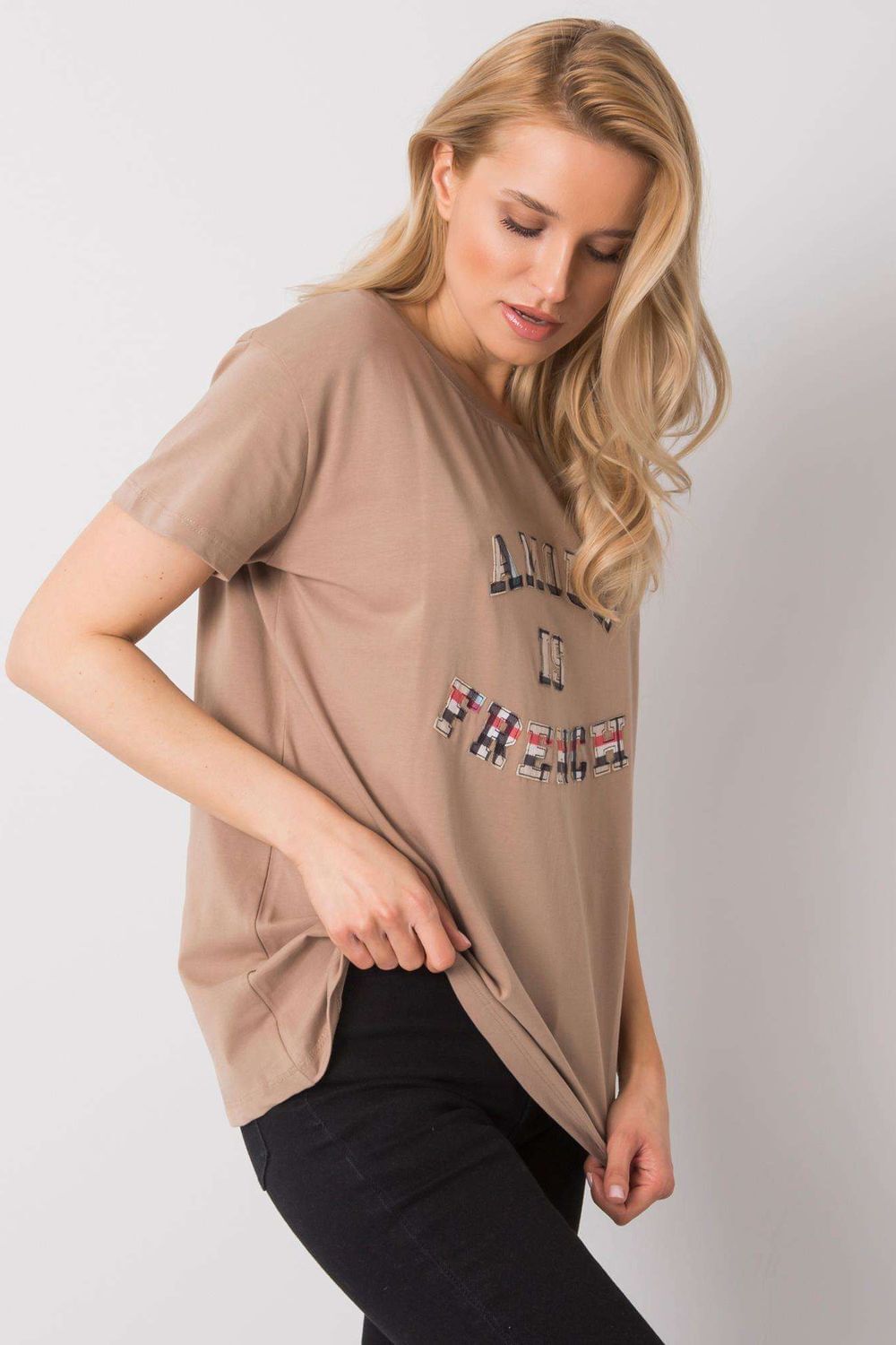 Women’s t-shirt in a looser cut, with short sleeves and a round neckline. Decorative inscription on the front.