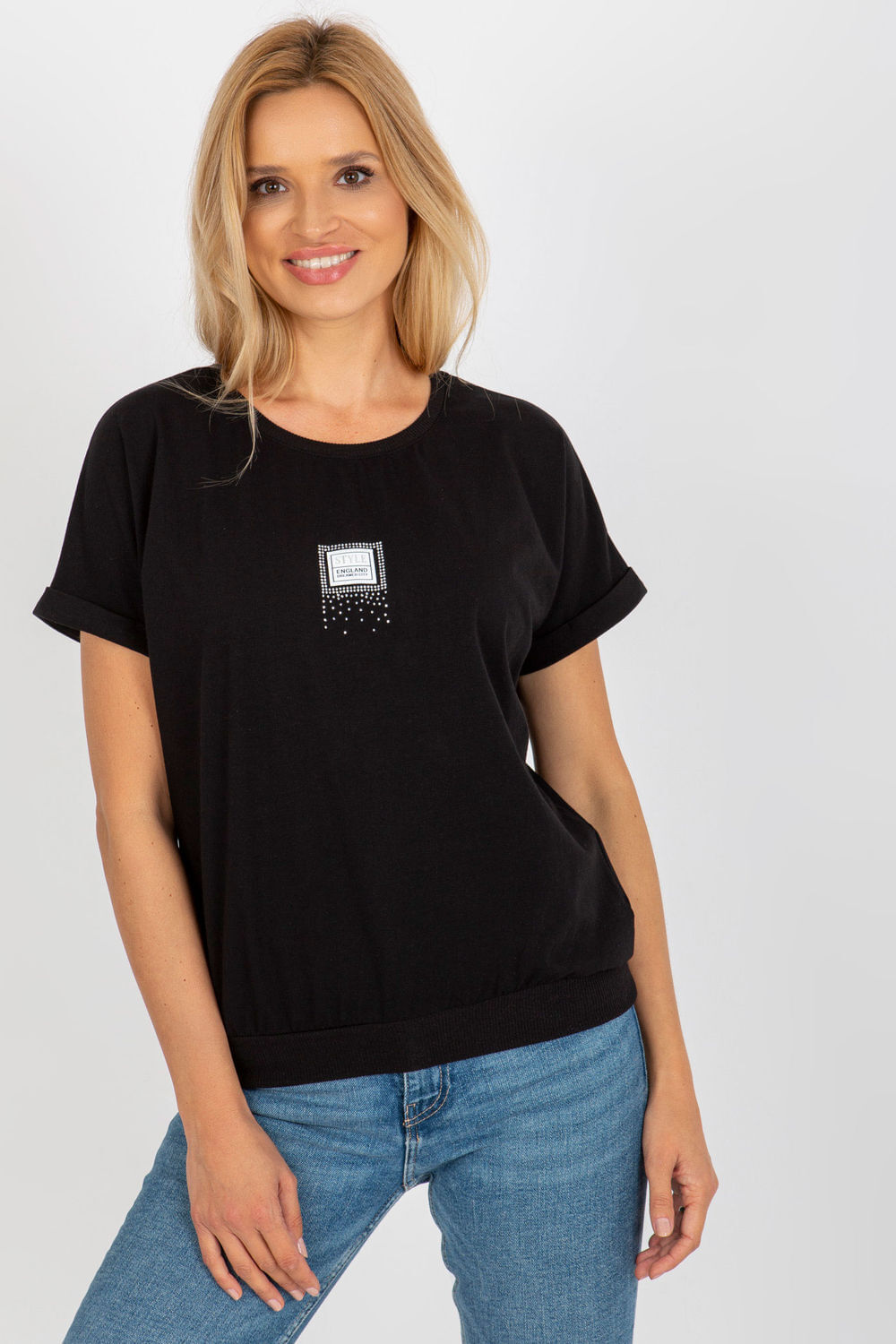 Women’s blouse with short sleeves and a round neckline. The blouse is made of solid material with a decorative patch on the front.