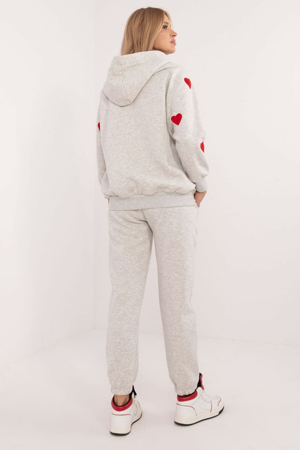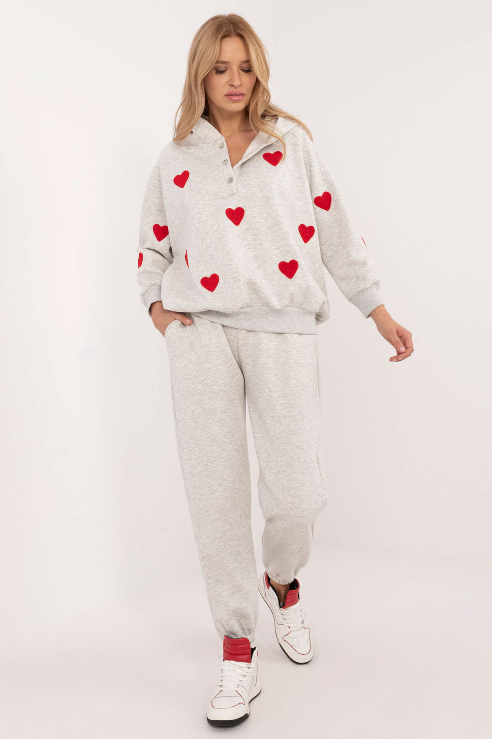 Warmed casual women’s sweatshirt set, ideal for everyday outings, consists of a sweatshirt and pants. Made from a combination of cotton and elastane, the set provides excellent comfort, warmth and flexibility, ideal for colder days. The pants have long legs finished with ribbed cuffs, which guarantees a comfortable fit, while the high waist with binding at the waist accentuates the silhouette and provides additional adjustment. In addition, side slip pockets are a practical solution for small items. The long-sleeve sweatshirt is fastened with a half-zip fastener, which adds to its stylish character and comfortable wear. It also features a hood, perfect for chilly days, and adorable heart-shaped patches that give the sweatshirt a unique and fashionable touch. This insulated set is the perfect combination of comfort, style and functionality for everyday styling.